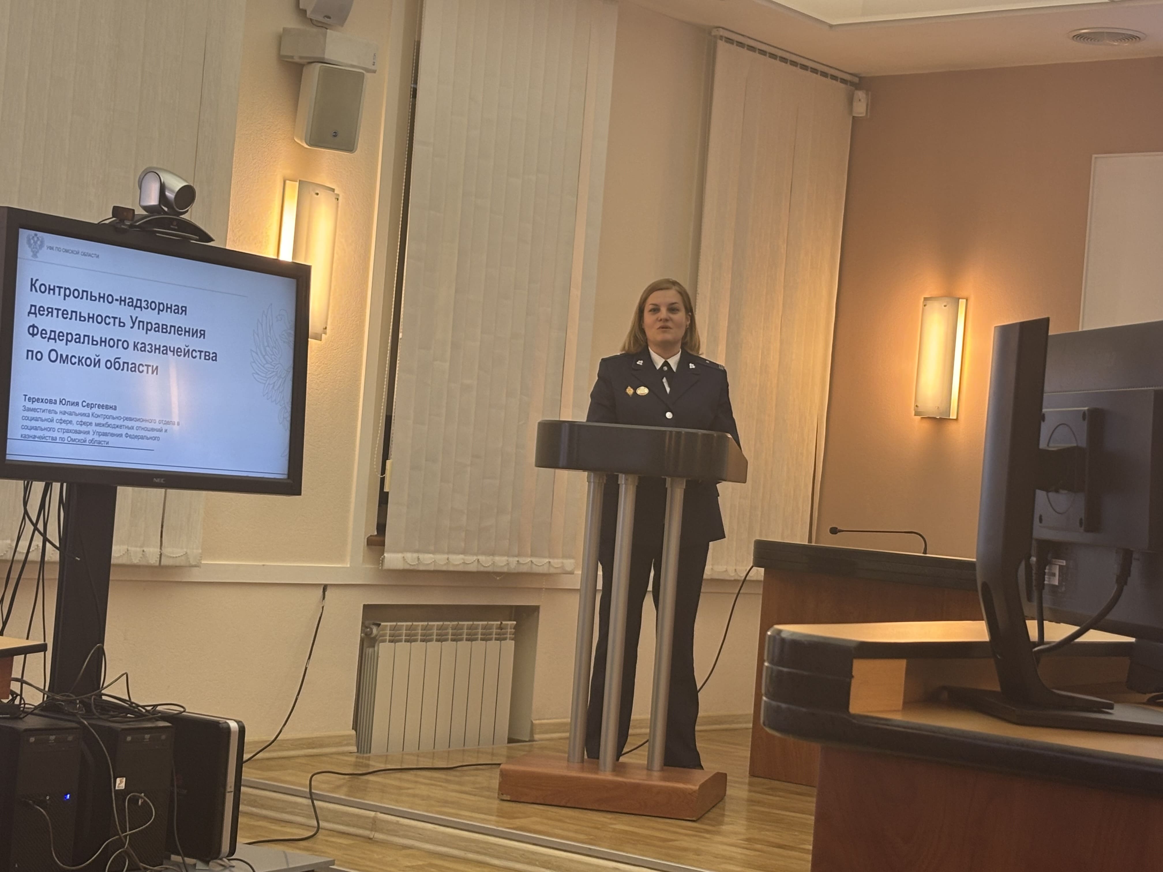 Особую заинтересованность у студентов вызвали вопросы организации и проведения контрольных мероприятий, осуществляемых УФК по Омской области. Об этом подробно рассказала Терехова Ю.С., заместитель начальника Контрольно-ревизионного отдела в социальной сфере, сфере межбюджетных отношений и социального страхования.